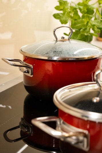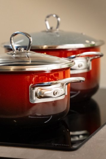 Nádobí PREMIUM OMBRÉ červený zaujme už na první pohled. Vnější povrch tvoří výrazný OMBRÉ efekt, kdy červená barva plynule přechází do černé. Tento způsob nástřiku vytváří jedinečný vizuální dojem a působí luxusně i nadčasově. Podobnou techniku už znáte z oblíbené řady Cappuccino – zde je ale zpracovaná v ještě odvážnějším a modernějším stylu.
